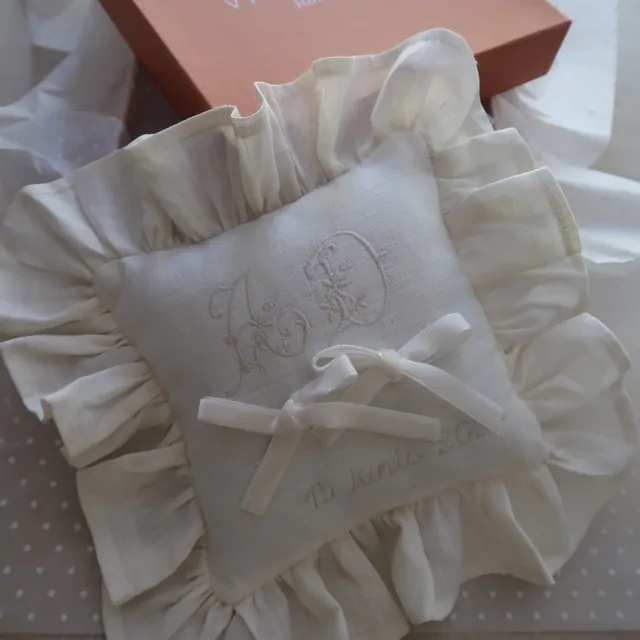 Cojín para anillos con volante de lino (20x20cm) o de encaje (16x16cm) – Villalegría