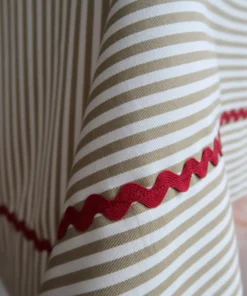 Mantel Picunela de rayas de algodón 100% en tono nuez para vestir la mesa de diario. el remate con picunela roja a contraste resulta perfecto para darle un aire antiguo y a la vez cálido.