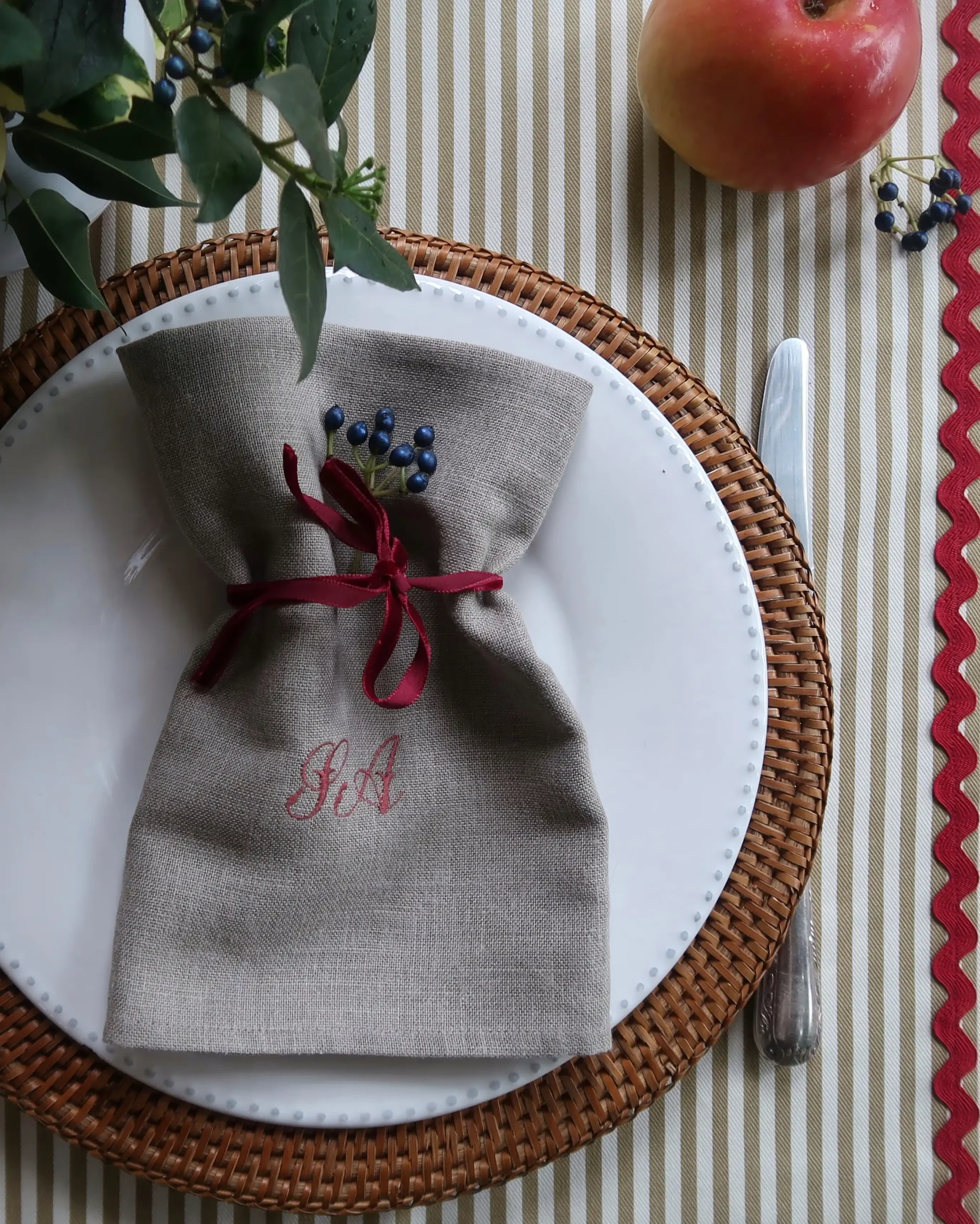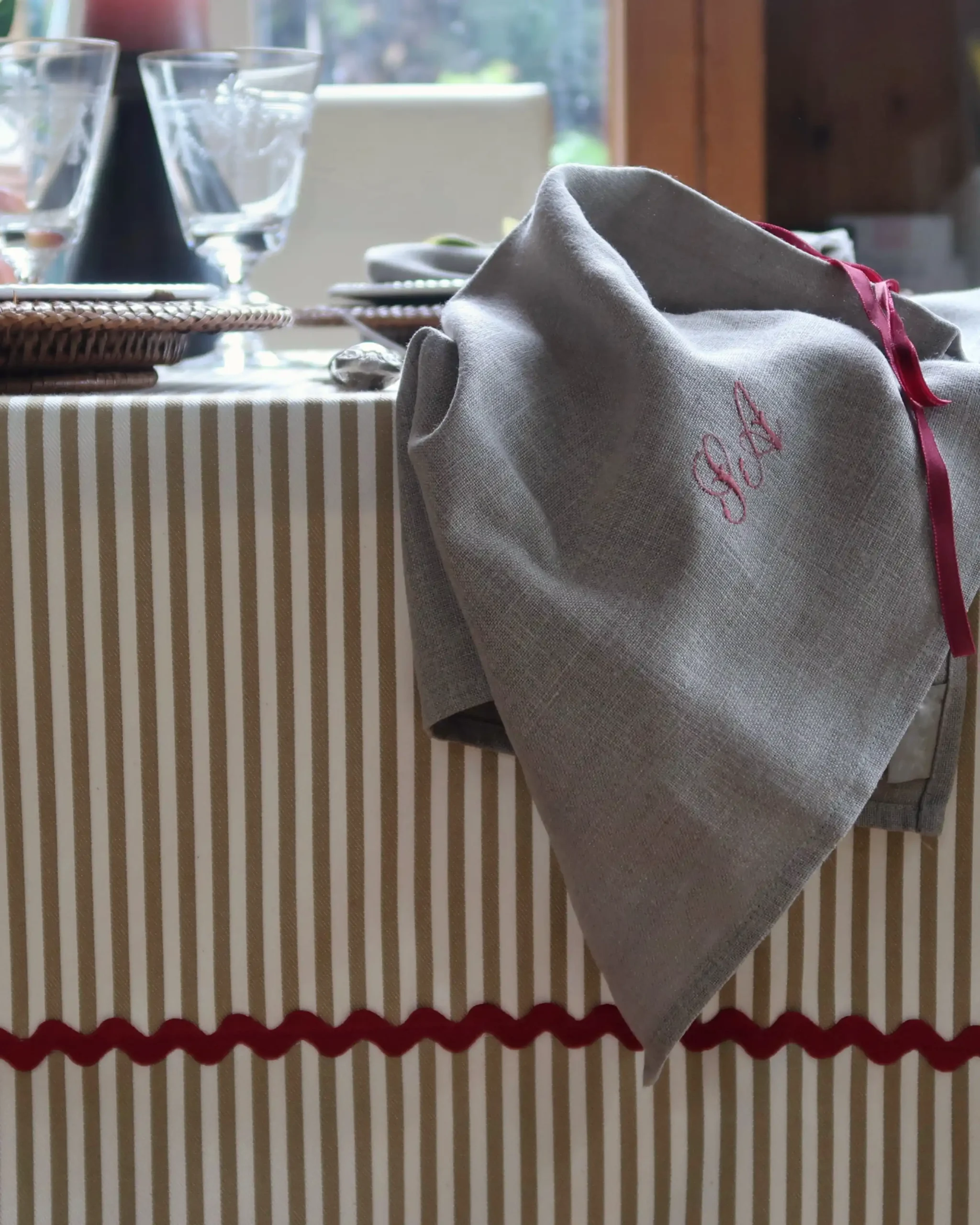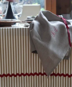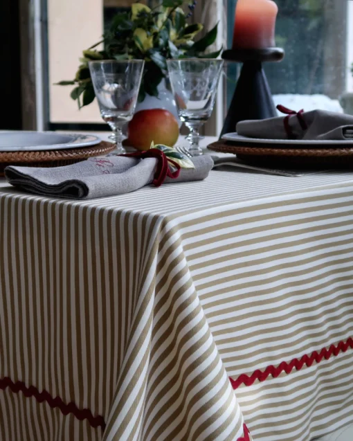 Las rayas tienen una larga historia en la moda y también en la decoración de modo que es un estampado versátil, clásico y a la vez intemporal. Este mantel es perfecto para el día a día porque prácticamente no necesita plancha. Combinadas con servilletas de color saco, bordadas en rojo, resultan ideales para Navidad.