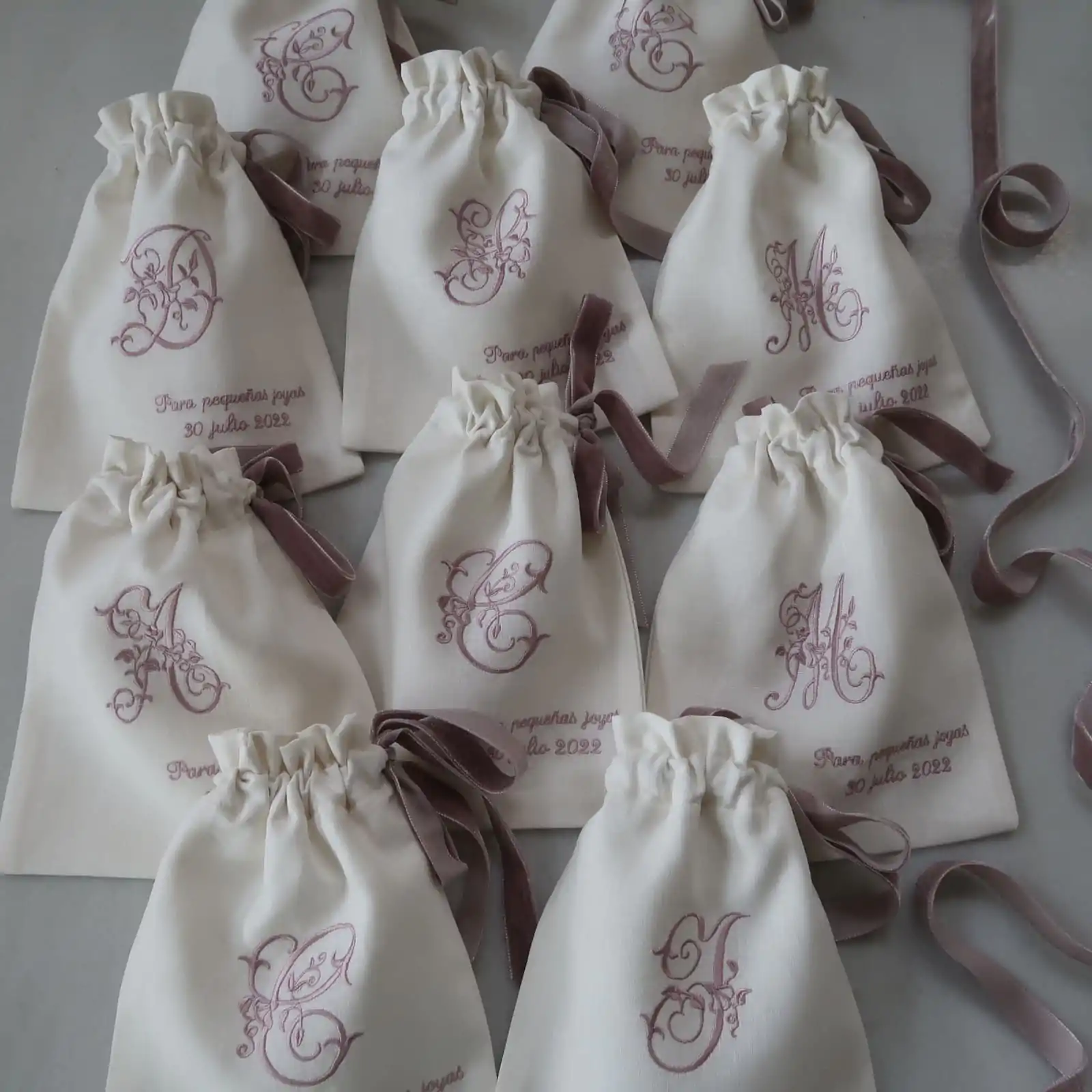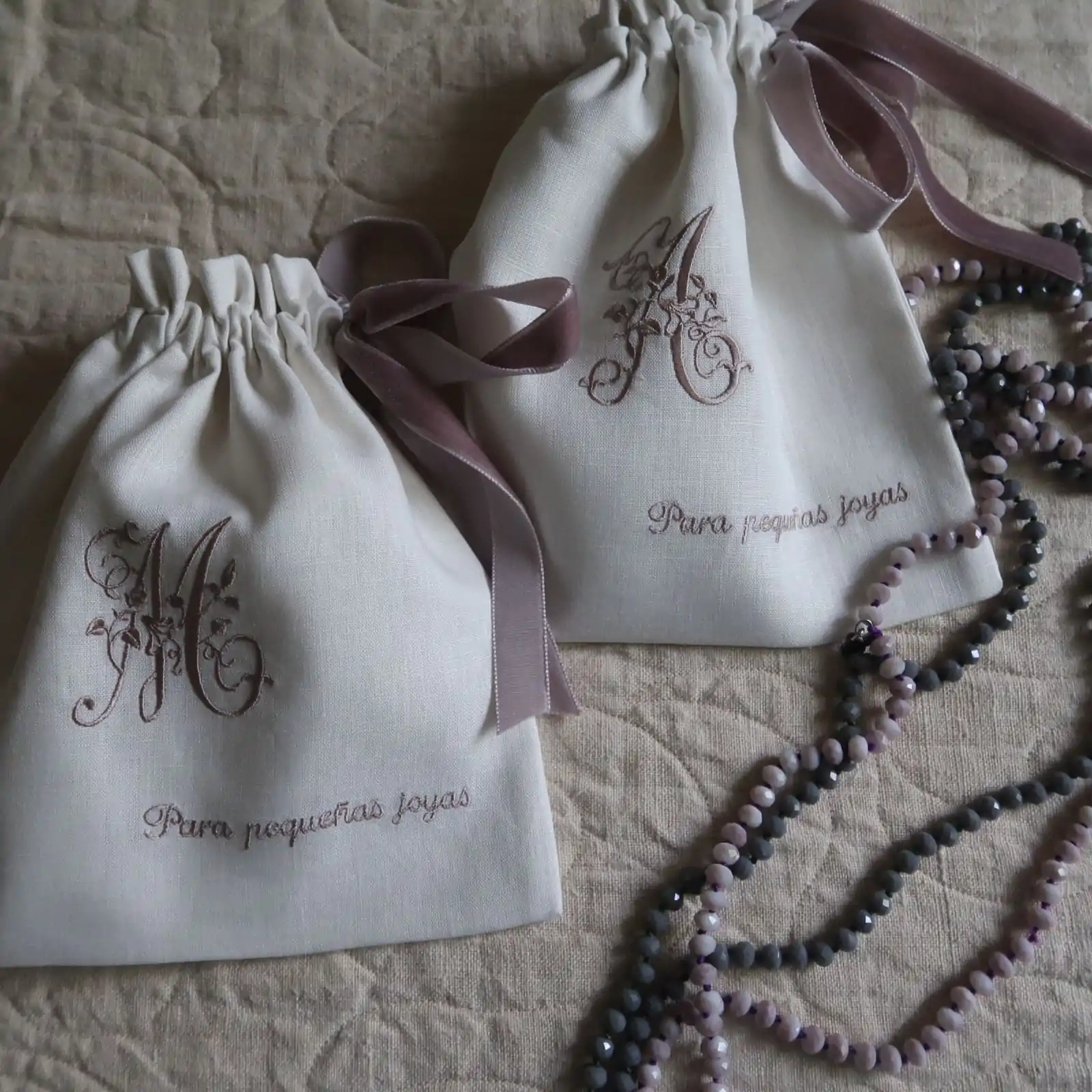 Saquitos para joyas, personalizados con iniciales bordadas en la tipografía que elijas. Hechos de lino 100%, revelan la belleza natural del material en su estado más puro.